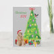 En la parte delantera de esta tarjeta de Navidades, un Cocker Spaniel Dog de color burdo lleva un sombrero de Papá Noel mientras se sienta junto a un árbol de Navidad. Los paquetes de regalo envueltos de forma brillante están dispersos por todo el mundo, y un bullfinch está aterrizando en el árbol de Navidad. El texto rojo y verde dice "Navidades DISFRUTAN". Dentro está el texto estilizado que dice MERRY CHRISTMAS, y un campo de texto para personalizar.