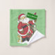 Este paño de lavado para tu baño es verde claro con Santa Claus parado en una pila de nieve sosteniendo un cartel de Feliz Navidad un árbol con cuentas rojas rodeado de pájaros y pequeños animales incluyendo un conejo y una ardilla.