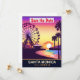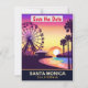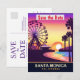 Santa Mónica salvar la fecha de la invitación de boda, tarjeta postal de viaje. Hermosa puesta de sol en la costa y rueda de la fortuna.