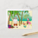 Esta postal del saludo del día de fiesta del navidad ofrece los pájaros tropicales lindos y coloridos que llevan los gorras de Santa.  Están caminando en la playa debajo para resolver Santa debajo de una palmera adornada con los ornamentos y las luces.