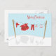 Diseño divertido con traje de Santa y objetos innombrables colgados en un tendedero en un día de invierno nevado.