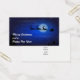 Feliz Navidad y feliz año nuevo. La imagen del frente es un ilustracion festivo de navidades. Santa en su trineo y su reno sobrevolando el oscuro cielo azul de la noche. Una luna brillante ilumina el cielo y se pueden ver estrellas brillantes por todas partes.