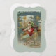 ¡Aquí viene Santa! Él está dirigiendo su asombrosa máquina voladora a través del cielo nocturno. Estrellas, rebozadores y decoraciones elegantes cubren el avión y su carga de maravillosos juguetes para Navidades por la mañana. La imagen restaurada de una postal victoriana presenta un fondo helado, acentos dorados y colores brillantes y bonitos. Está enmarcado en músculos y adornos con un pueblo de Navidades al fondo.