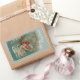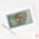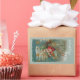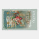 ¡Aquí viene Santa! Él está dirigiendo su asombrosa máquina voladora a través del cielo nocturno. Estrellas, rebozadores y decoraciones elegantes cubren el avión y su carga de maravillosos juguetes para Navidades por la mañana. La imagen restaurada de una postal victoriana presenta un fondo helado, acentos dorados y colores brillantes y bonitos. Está enmarcado en músculos y adornos con un pueblo de Navidades al fondo.
