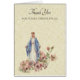 Esta es una hermosa imagen tradicional de la Santísima Virgen María, Nuestra Señora de la Gracia con flores a sus pies y un fondo de encaje beige. El texto interior puede ser personalizado o eliminado para dejar en blanco.