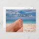 Postal de los pies de las mujeres con esmalte de uñas rojo rosado en una playa blanca en una isla en el mar mediterráneo relajándose durante las vacaciones de verano con el texto: 'Saludos desde Cerdeña'.