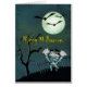 Divertido ilustracion de Halloween de una momia en una escena nocturna aterradora con luna llena, árbol muerto y murciélagos. Un texto muy detallado de Happy Halloween en color amarillo y tipografía espeluznante.