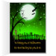 Un esqueleto aterrador que camina en un patio de tumbas con luna llena y fondo de cielo verde. Diseño muy divertido y aterrador para tus tarjetas de felicitación de Halloween.
