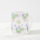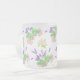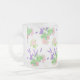 Una taza de vidrio esmerilado de bonito, con un patrón de rosas rosadas, cremoso morado Naranja Mock y lavanda morada, de un diseño acuarela pintado a mano por Judy Adamson.