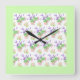 Reloj de pared floral de bonito, con un patrón de rosas rosadas, cremoso Naranja de pavo blanco y lavanda morada, en un borde verde claro, a partir de una acuarela pintada a mano por Judy Adamson.