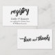 Estos elegantes insertos de tarjetas de detalle fueron diseñados para coincidir con otros elementos de un creciente conjunto de bodas y eventos que presenta un diseño sencillo en blanco y negro. En la parte delantera se lee "registro" en un guión audaz, moderno, letra manuscrita; en la parte trasera he colocado un gráfico muy bien representado de las palabras "amor y agradecimiento". Todos los tipos editables se representan en un tipo versátil de serif. Simplemente utilice los campos de plantilla y reemplace el texto de relleno con sus propios datos personales para que estas tarjetas sean suyas. El fondo puede cambiarse a cualquier color de la paleta boda que prefiera. Por favor, no dudes en contactarme si tienes solicitudes especiales o necesitas otros artículos. También estoy contento de ayudar con la personalización de estas tarjetas si lo necesitas. // 89 // Diseñado por Melody Watson para la Muserie de papel