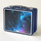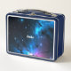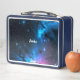 Elegante caja de almuerzo de cielo nocturno de fantasía con estrellas azules y rosas, y el nombre de su hijo personalizado en la parte delantera.