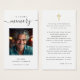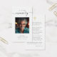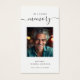 Honra a tu ser querido con nuestra Tarjeta de Oración de Fotos Funerales Script In Loving Memory. Esta elegante tarjeta cuenta con una preciada foto y una sincera oración, perfecta para proporcionar confort en un momento de pérdida. Diseñado con un toque minimalista y moderno, incluye una bella caligrafía de escritura y un salmo o oración de su elección. Ideal como conservador de memorias de simpatía, esta tarjeta es adecuada para ceremonias religiosas, incluyendo funerales católicos y cristianos. Personalízalo para crear un tributo significativo que la familia y amigos apreciarán.