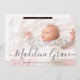 Presenta a tu bella niña con un elegante guión de anuncio de nacimiento con fotos: comparte la alegría de tu recién nacida con la familia y amigos de una manera elegante y sentida usando nuestro guión de anuncio de nacimiento con Personalizado de bebé. Esta tarjeta plana te permite personalizar con el nombre de tu bebé, la adorable foto, la fecha de nacimiento y las estadísticas, creando un hermoso recuerdo que tus seres queridos apreciarán. La elegante tipografía de escritura añade un toque de sofisticación, haciendo de la invitación un placer para todos los que la reciben. La combinación de diseño moderno y elegancia clásica pone a la vista el valioso agregado de tu familia. Nuestra plantilla fácil de usar hace que sea fácil personalizar la tarjeta con el nombre de su bebé, la adorable foto, la fecha de nacimiento, el peso, la longitud y cualquier otro detalle que desee incluir. La parte posterior de la tarjeta también ofrece espacio para otra foto donde se puede incluir un mensaje personalizado, el nombre completo del bebé y los nombres de los padres, añadiendo un toque extra de amor y personalización. Al enviar este anuncio de nacimiento, presentas a tu pequeño con estilo, creando una memoria muy apreciada para todos los destinatarios. La elegante tipografía de escritura complementa la preciosa foto de tu bebé, haciendo una presentación visualmente impresionante que transmite tu alegría y emoción. ¡Felicidades por el nacimiento de tu hermosa niña! Con nuestro anuncio de nacimiento de un Personalizado con nombre de bebé, puedes compartir la felicidad y celebrar este momento especial con las personas que más importan en tu vida.