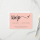 Presentamos nuestro Simple Script RSVP sin Mailing Reserved Seat, una solución moderna y práctica para recopilar RSVPs para su evento. Esta tarjeta RSVP presenta un diseño sencillo y elegante con un estilo de letra manuscrita de escritura a la moda y una base rosa brillante, lo que añade un toque de sofisticación y estilo. Diseñada para aquellos que prefieran recibir confirmaciones por correo electrónico o por teléfono, esta tarjeta permite a sus invitados responder fácilmente a su evento sin necesidad de enviarlo de vuelta. Al incluir la información necesaria, como el número de clientes y los datos de contacto, se simplifica el proceso RSVP y se elimina la necesidad de sobres y sellos de retorno, se ahorran costes y se garantiza la funcionalidad. Personalizar esta tarjeta RSVP según sea necesario para su evento específico. Ya sea boda, fiesta o cualquier otra ocasión, puede personalizar la tarjeta para que se adapte a sus necesidades y reflejar el tema o estilo de su evento. La combinación de la fuente de escritura de moda y la base de color rosa negro crea una estética de moda y moda, haciendo una declaración elegante para su evento. Es atractivo visual y funcional, proporcionando una manera perfecta y cómoda para que sus huéspedes puedan acceder a RSVP. Nuestro sencillo RSVP Script sin Mailing Reserved Seat es la elección perfecta para aquellos que buscan una solución moderna y sin complicaciones para la recolección de RSVP. Simplifique el proceso de planificación de eventos y añada un toque de elegancia y estilo. Póngase en contacto conmigo si necesita ayuda para este diseño en info@lddesignloft.com