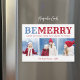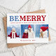 Tarjetas de foto magnéticas de Navidad personalizado y económicas con una plantilla sencilla para la personalización. Este bonito diseño festivo presenta una tipografía audaz de BE MERRY en colores azules y rojos. El saludo de abajo dice "Felices vacaciones de nuestra familia a la tuya". Personalízalo con 3 fotos familiares, sus nombres y el año. Utilice las herramientas de diseño para elegir cualquier color de fondo, editar los tipos de letra y colores del texto o añadir más fotos para crear una única tarjeta de fotografía navideña.