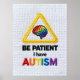 Diseño de parches bordados coloridos con un cerebro de arco iris dentro de un triángulo amarillo con la frase cosida: "Sé paciente, tengo autismo". Esta obra de arte creativa promueve la conciencia del autismo, la comprensión del TDAH y la aceptación de la neurodiversidad, la paciencia motivadora, la empatía, el empoderamiento y la inclusión en la vida cotidiana.