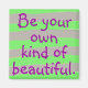 Este imán está hecho con un patrón rayado gris pintado a mano y verde florescente. Y dice: "Sé tu propio tipo de hermosa". Un estímulo perfecto para ti mismo o para regalarte.