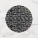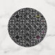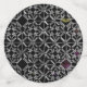 Un intrincado patrón de cruces y círculos grises que se entrelazan sobre un fondo negro con sólo un toque de color.