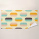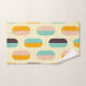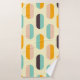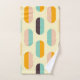 A seamless geometric pattern features vertical, oval shapes in soft yellow, teal, peach, orange, and brown, creating a retro, playful vibe.