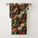 A richly detailed and vintage-inspired seamless botanical pattern or wallpaper. The design features a dense arrangement of contrasting elements: large, striking red mushrooms (like Fly Agaric or Amanita muscaria), bright red strawberries, and clusters of delicate white daisies or chamomile flowers. The foliage, dominated by deep green leaves and vines, is set against a dark, near-black background, giving the pattern an elaborate, baroque or cottagecore feel.