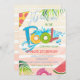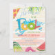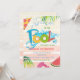 Invitación de verano para la fiesta de cumpleaños de la piscina con arena, salpicaduras, sandía y hojas tropicales.