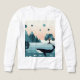 It features a large whale swimming in the water, small fish, mountainous trees, and circles floating in the sky.