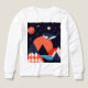 The image is a flat-style graphic illustration depicting a cosmic night scene with a mountainous landscape and a flying whale.