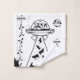 Un gracioso ilustracion blanco y negro de un objeto volador no identificado, OVNI secuestrando vacas de un campo. El giro aquí es que los pilotos de las naves espaciales también son vacas. Un diseño divertido con temática de granja.