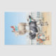 Vaca, oveja, pollo y pato en la playa en la arena con valla de piquete blanco y fondo oceánico y cielo. 15 x 20 18 lb