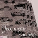 Dibujos de una variedad de autos antiguos o antiguos en un fondo de color taupe con piedras de ladrillo e impresos de periódico.