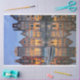 Edificios de la ciudad sobre papel de tejidos de desunión del río