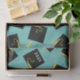 Clase creativa del regalo de graduación '25 y papel de tejido fiesta con tapones de pato negro y dorado sobre fondo azul verde azulado.