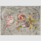 Magníficos tulipanes holandeses, rosados y morados con rayas, atados con cinta dorada, contra un fondo de antiguos papeles oficiales descompuestos. Flores de ephemera vintage - papel tisular desacoplado.