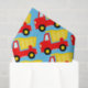 Colorido juguete volcado niños camioneros Papel de regalo de cumpleaños. relleno de personalizado para regalos y favores de fiesta para niños. Suministros de moda para fiestas y accesorios DIY para divertidos cumpleaños o fiestas de duchas de bebé, etc. Color de fondo de personalizable detrás del patrón rojo del camión de basura. Ilustracion de vehículos de construcción para niños.