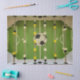 Papel de tela de regalo con la imagen de una mesa de futbolín en colores verdes, amarillos, blancos y negros.