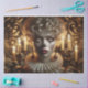 Una mujer arlequina cautivadora y enigmática, mirando hacia delante con ojos brillantes e hipnóticos que parecen atravesar el velo de la realidad. Su cara de porcelana está adornada con marcas clásicas pero surrealistas de arlequín: patrones de diamante afilados, pintura teatral de contrabando o delicados diseños de fibra que brillan en la luz. Sus labios están pintados en un tono profundo y dramático, ligeramente separados como si tuviera un secreto indecible.