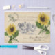 En un corral con un poco de valla rústica de madera, con hermosos girasoles vintage y una libélula, una postal francesa vintage con crema de sepia, con escritura a mano y marcas postales, se colocan grandes pollos de cosecha en un bonito papel de tejido floral con temática francesa y agrícola para envolturas de regalo o descomposición, artes y artesanías.