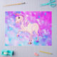 Papel higiénico de unicornio para niños con la imagen de un unicornio sobre un fondo morado, rosa y azul.