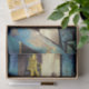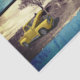 Papel de papel de regalo con la imagen de una camioneta amarilla en un camino de tierra solitaria y una antigua valla rústica azul.