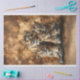 La obra representa una escena real de un león y tres cachorros, adornados con una corona, ambientados en un fondo abstracto de color dorado-marrón. El león y los cachorros se representan con detalles realistas, mostrando la textura de su piel y los diseños ornamentales de sus coronas. El fondo incluye elementos de goteo de pintura y salpicaduras, que realzan el majestuoso arte de la vida salvaje.