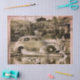 Vieja foto de los veraneantes paseando en canoa y viajando en coche. Un poco desconcertada con texturas y una superposición de color rosa.