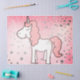 Papel de papel de regalo con una imagen de unicornio sobre fondo estelar rosado.