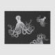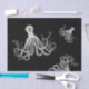 Un gran pulpo vintage de color blanco se coloca sobre un fondo negro para hacer un gran papel de tejido con temática marina y playera, perfecto para envolturas de regalo o desempate y artesanías.