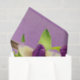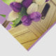 Papel de tejido con imagen de tulipanes morados y blancos sobre un fondo de lavanda en una caja de madera.