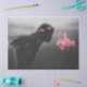 Papel higiénico de regalo con la imagen de una joven chica con una guirnalda florida en el pelo y admirando un ramo de flores rosadas con un fondo blanco y negro,