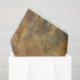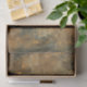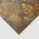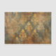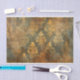 Decoración ornamentada en tonos dorados, turquesa y rojizo. El diseño presenta motivos intrincados, simétricos o arabescos que se parecen a hojas de acanto estilizadas, rollos y elementos florales dispuestos en columnas verticales. Los patrones tienen una apariencia angustiada y caprichosa con zonas desvanecidas y desgastadas, revelando turquesa y roya debajo de la capa superior dorada. Este efecto patino envejecido le da al diseño un toque antiguo o vintage.