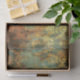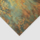 Decoración ornamentada en tonos dorados, turquesa y rojizo. El diseño presenta motivos intrincados, simétricos o arabescos que se parecen a hojas de acanto estilizadas, rollos y elementos florales dispuestos en columnas verticales. Los patrones tienen una apariencia angustiada y caprichosa con zonas desvanecidas y desgastadas, revelando turquesa y roya debajo de la capa superior dorada. Este efecto patino envejecido le da al diseño un toque antiguo o vintage.