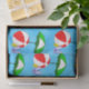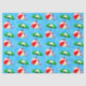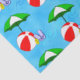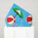 Papel de tejidos con divertida playa o piscina, arte de una bola de playa roja, sombrilla verde, sandalias de vacaciones y aceite de sol sobre un fondo azul ondulado.