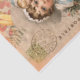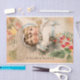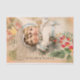 Niño vintage y chica con postale a la carta y sello postal en el fondo de rosa vintage con ephemera de tipografía.